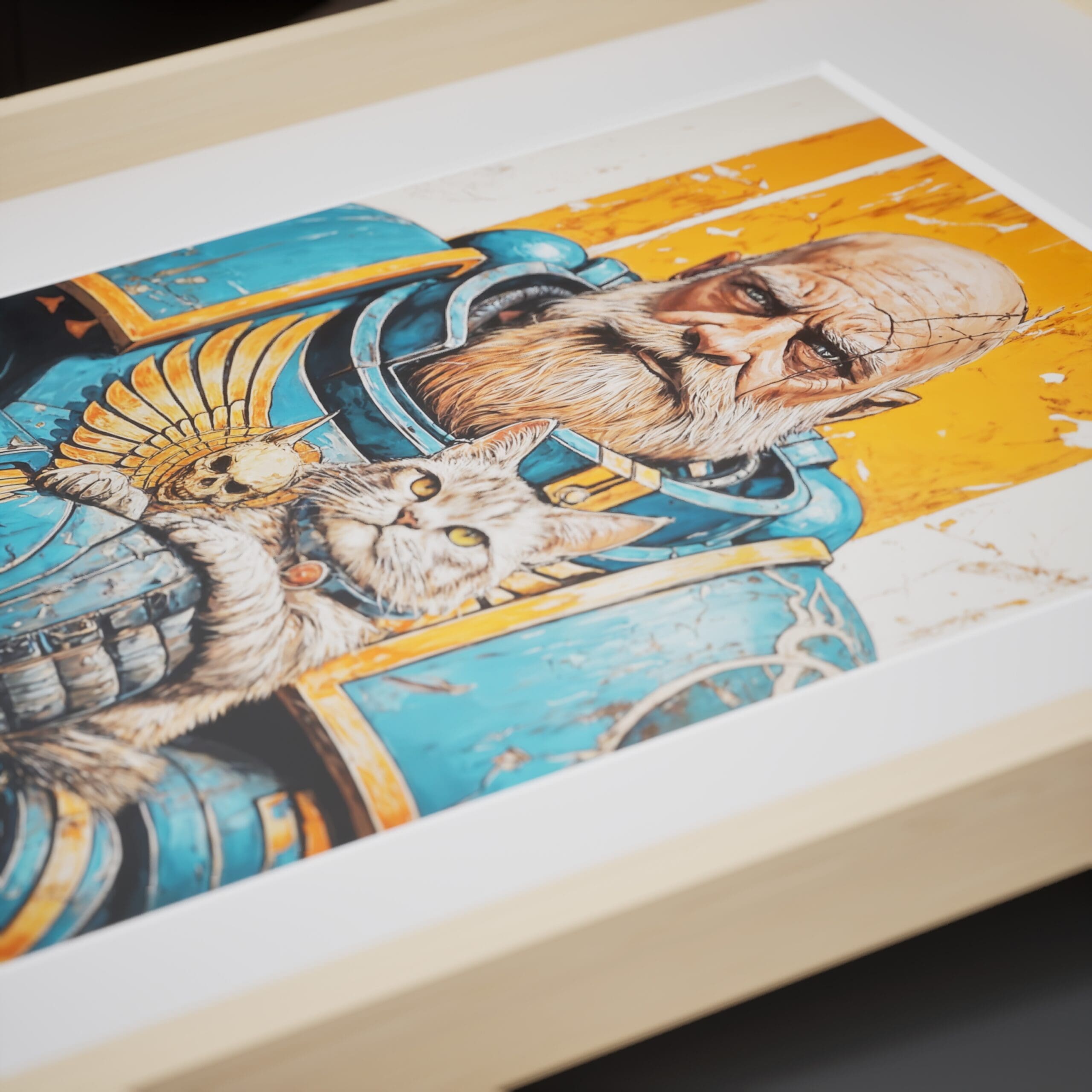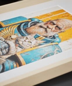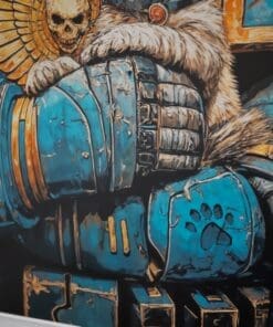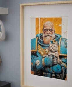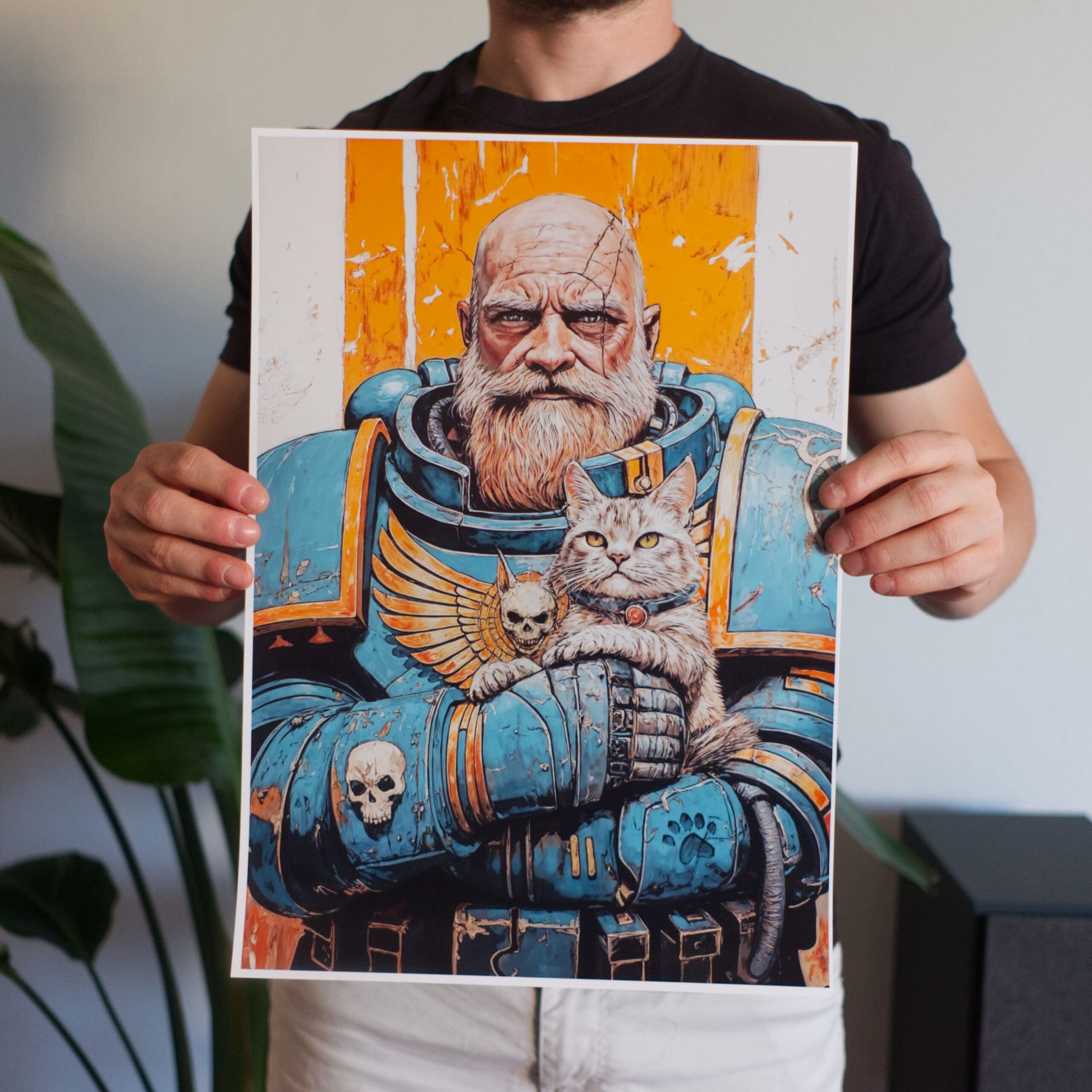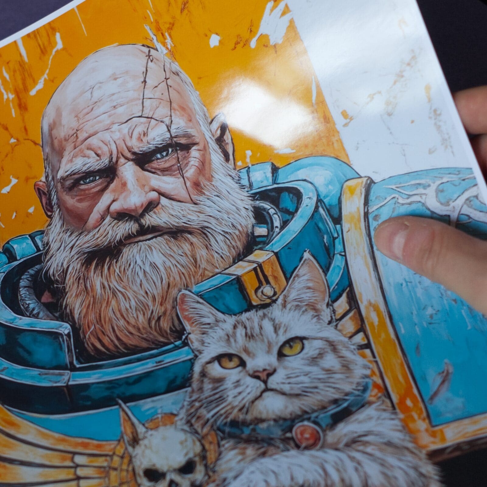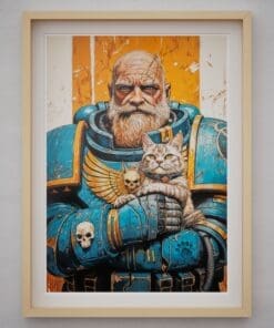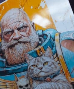 An epic illustration poster from warhammer universe. The great Ultramarine guardian gently cradling his grumpy cat companion. Rich linework, painterly textures and a warm orange backdrop make it a striking piece of wall art for any geeky, grimdark-loving home