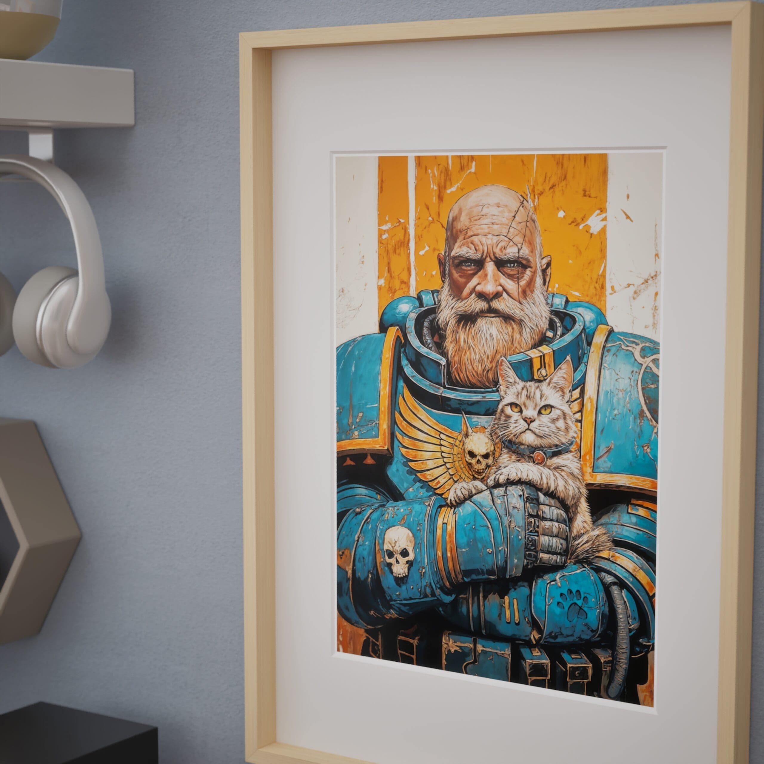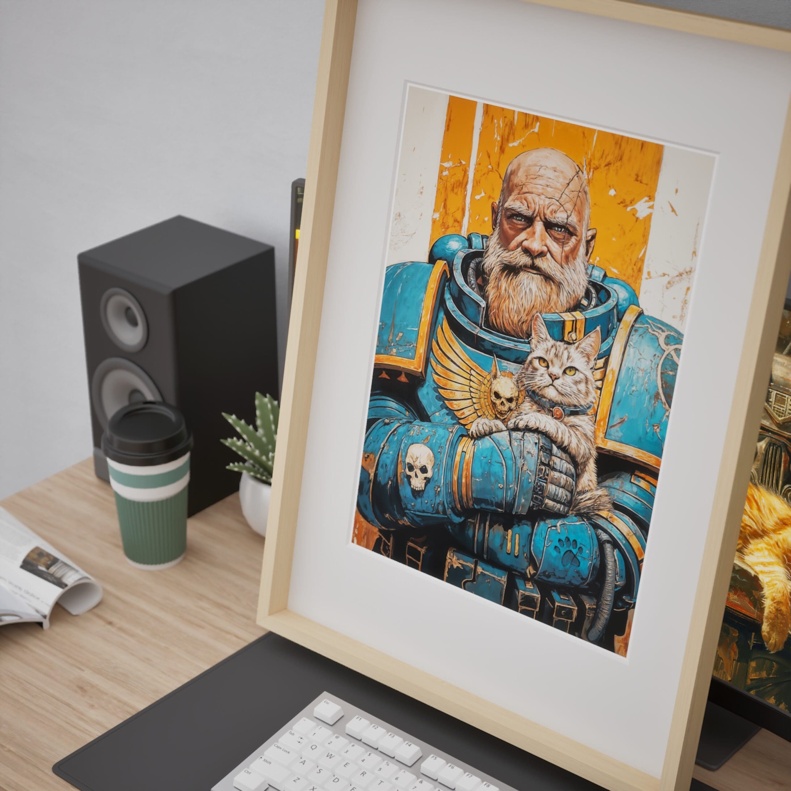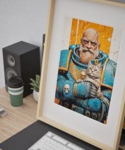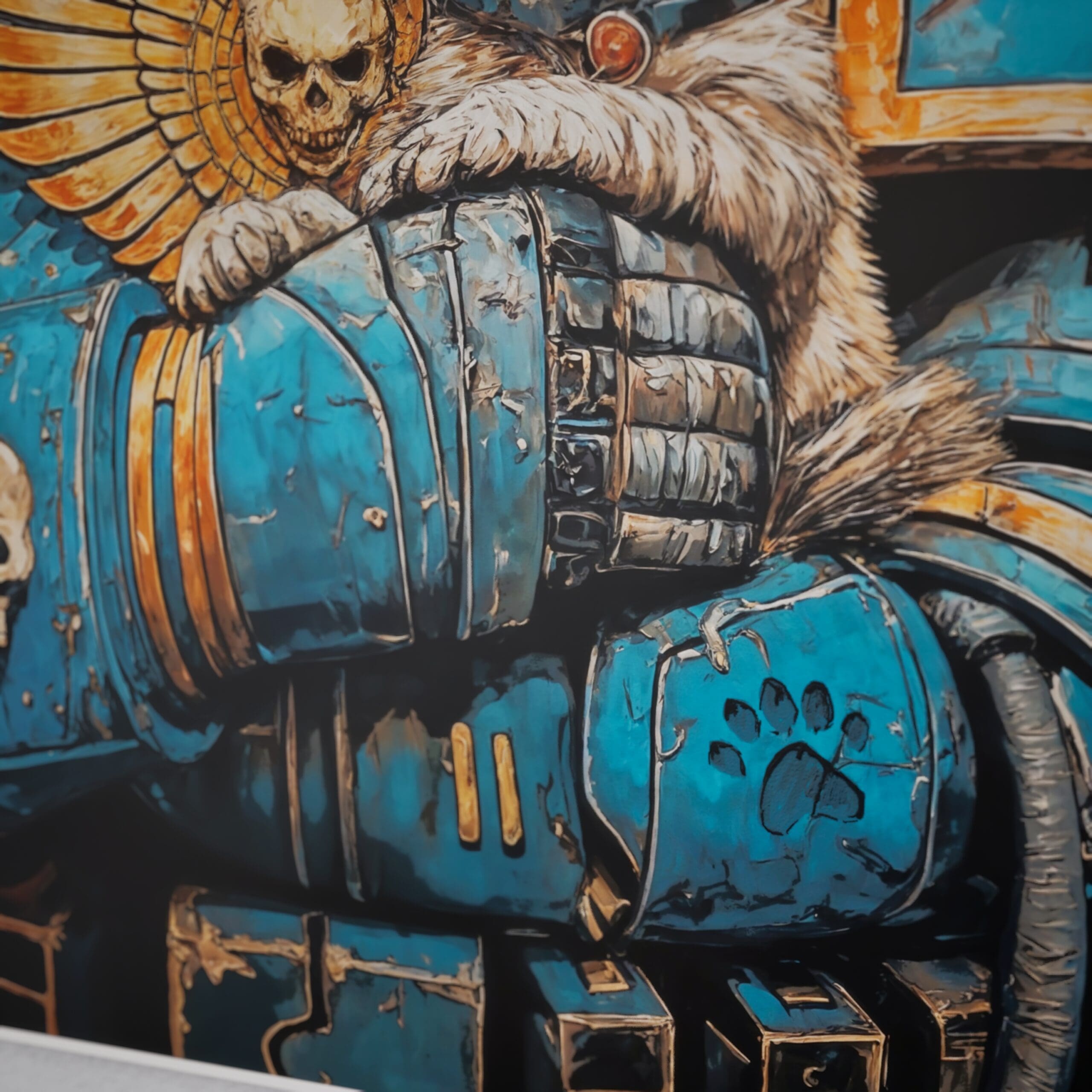 An epic illustration poster from warhammer universe. The great Ultramarine guardian gently cradling his grumpy cat companion. Rich linework, painterly textures and a warm orange backdrop make it a striking piece of wall art for any geeky, grimdark-loving home