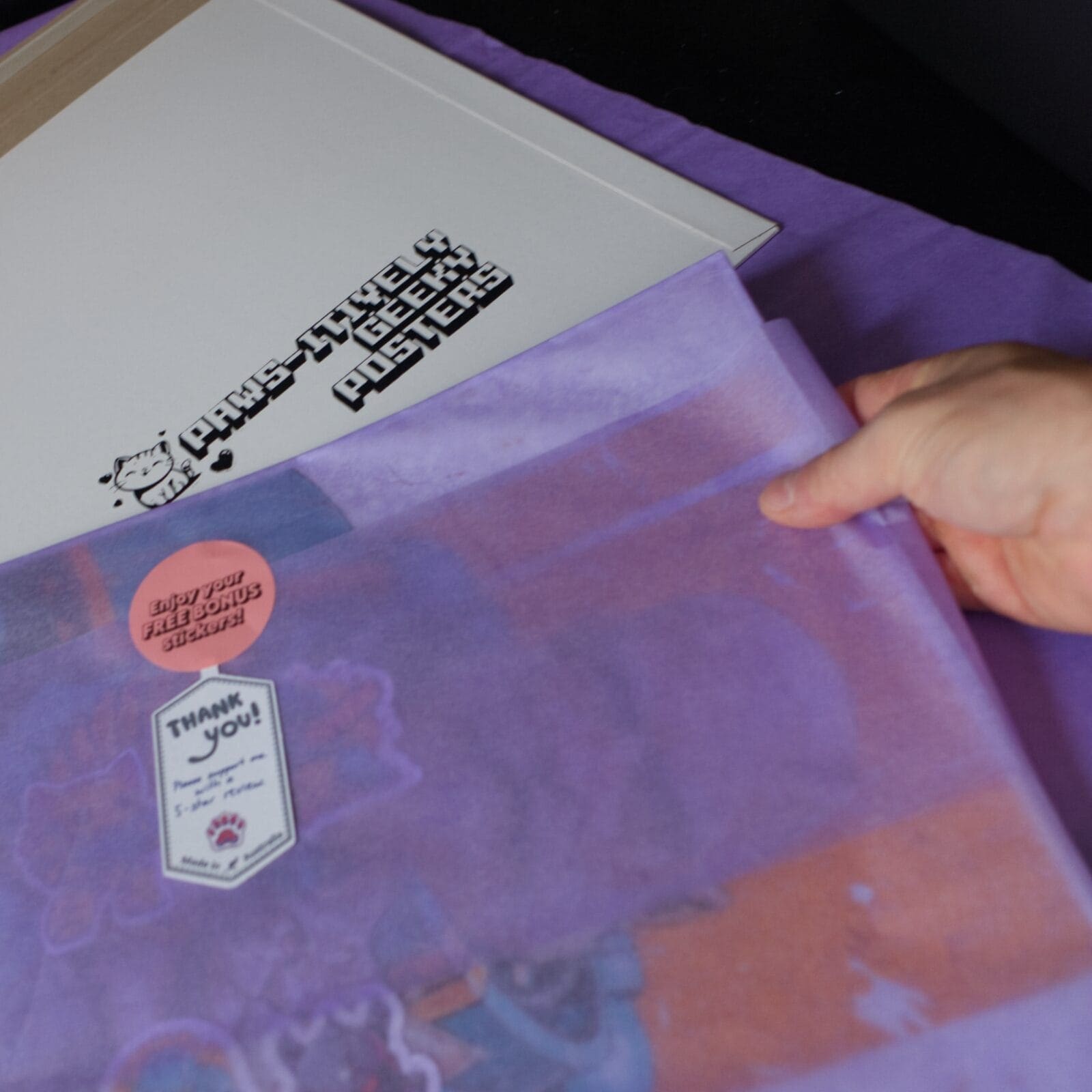 – 180gsm glossy paper (A3) – comes flat in a large thick envelope, it has a small white boarder showed on the photos. 180gsm paper is thicker and sturdier than standard printer paper, but not too heavy. It’s similar to the weight of a high-quality magazine cover or a greeting card. The glossy finish enhances the vibrancy of colors and adds a smooth, reflective surface, giving the artwork a polished, professional look. It’s durable enough for display but still light and easy to handle or frame.